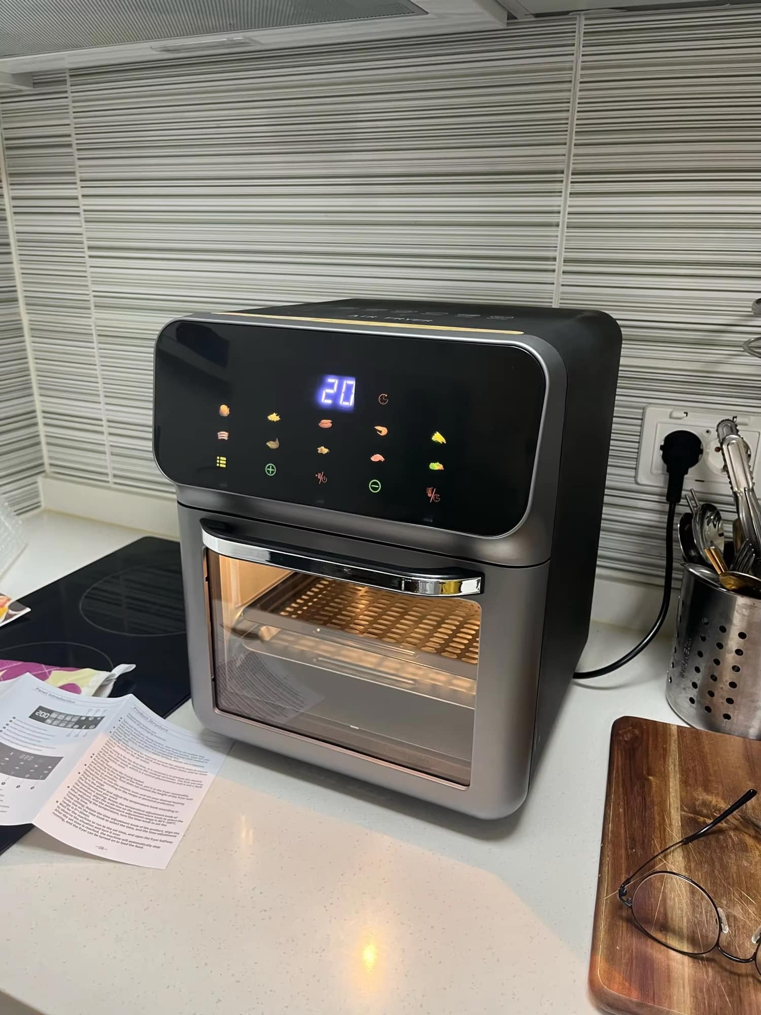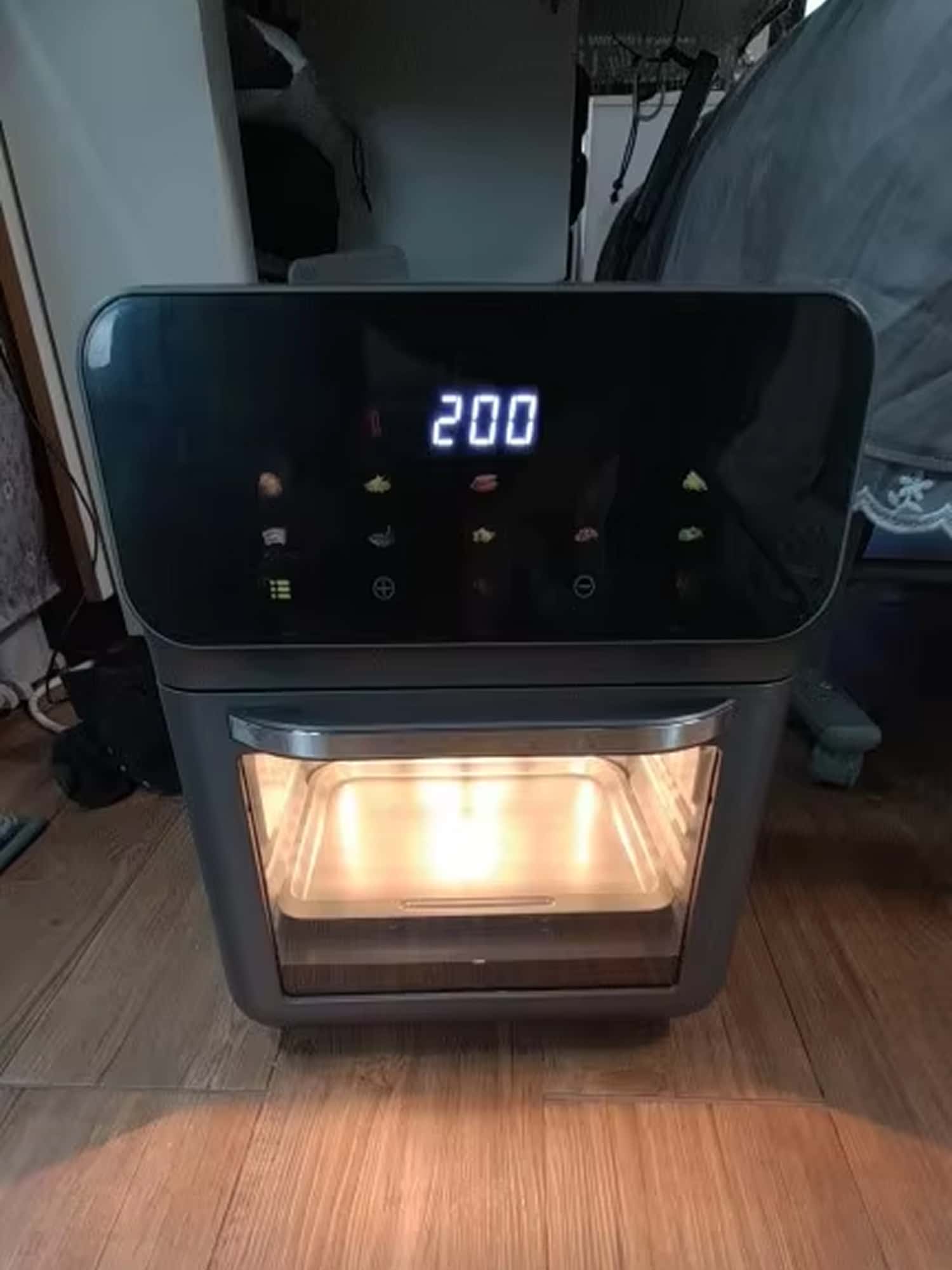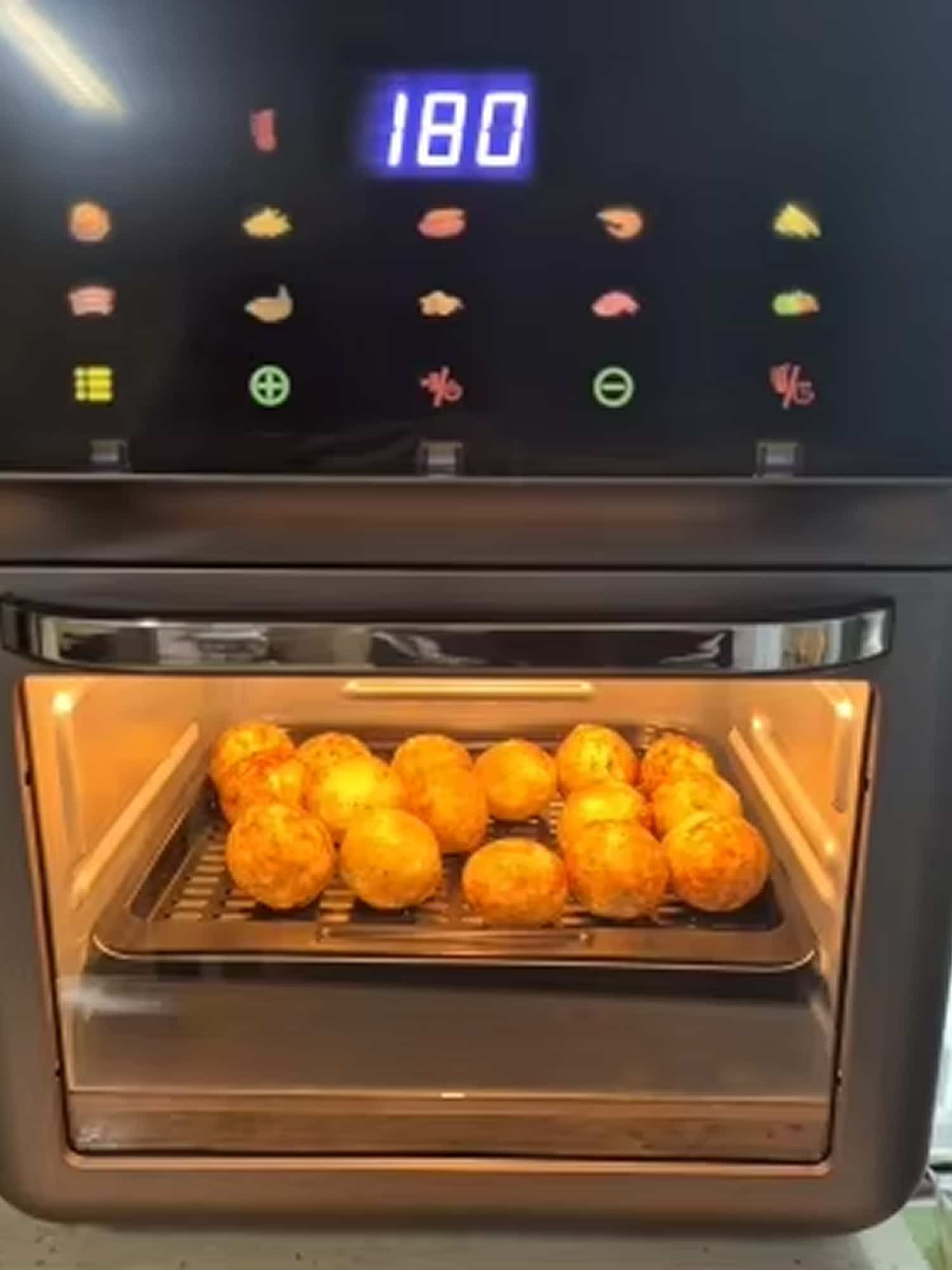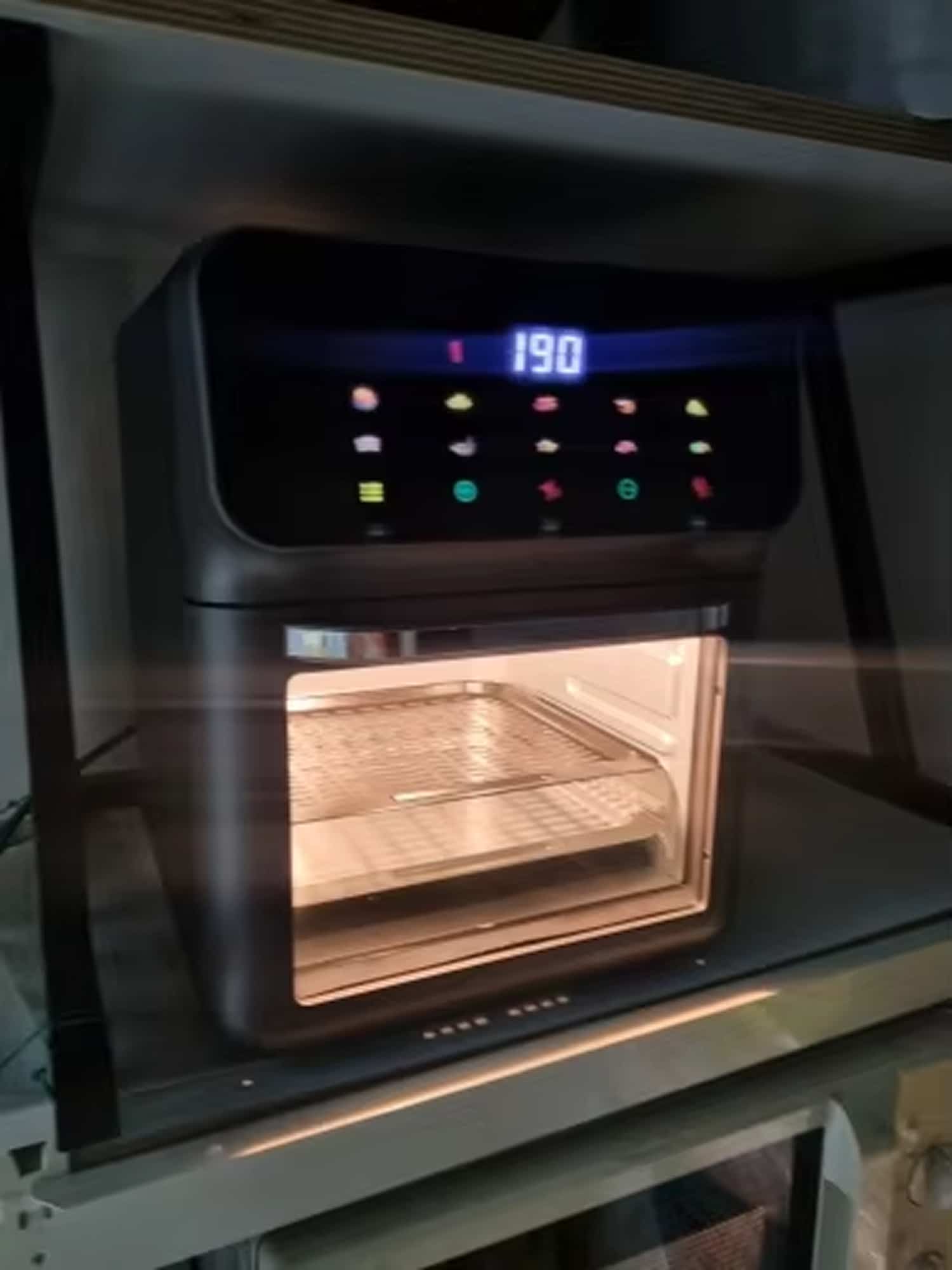 The smart touch panel features intuitive controls with clear displays, making temperature and time adjustments simple for all users.