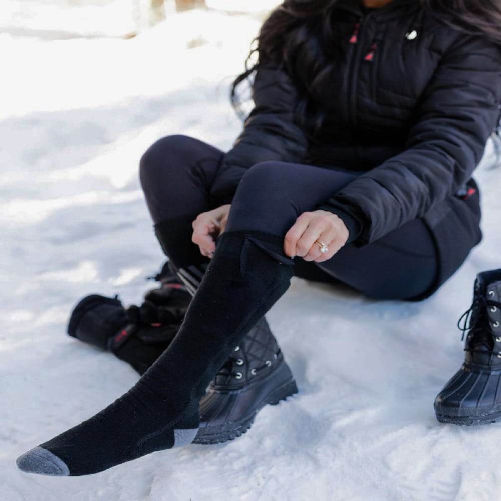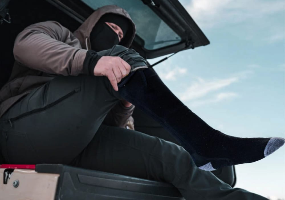 EmberSoli Heated Socks feature easy-access controls located on the cuff, allowing you to cycle through three heat settings with a simple press. The intuitive design ensures straightforward operation even while wearing gloves.