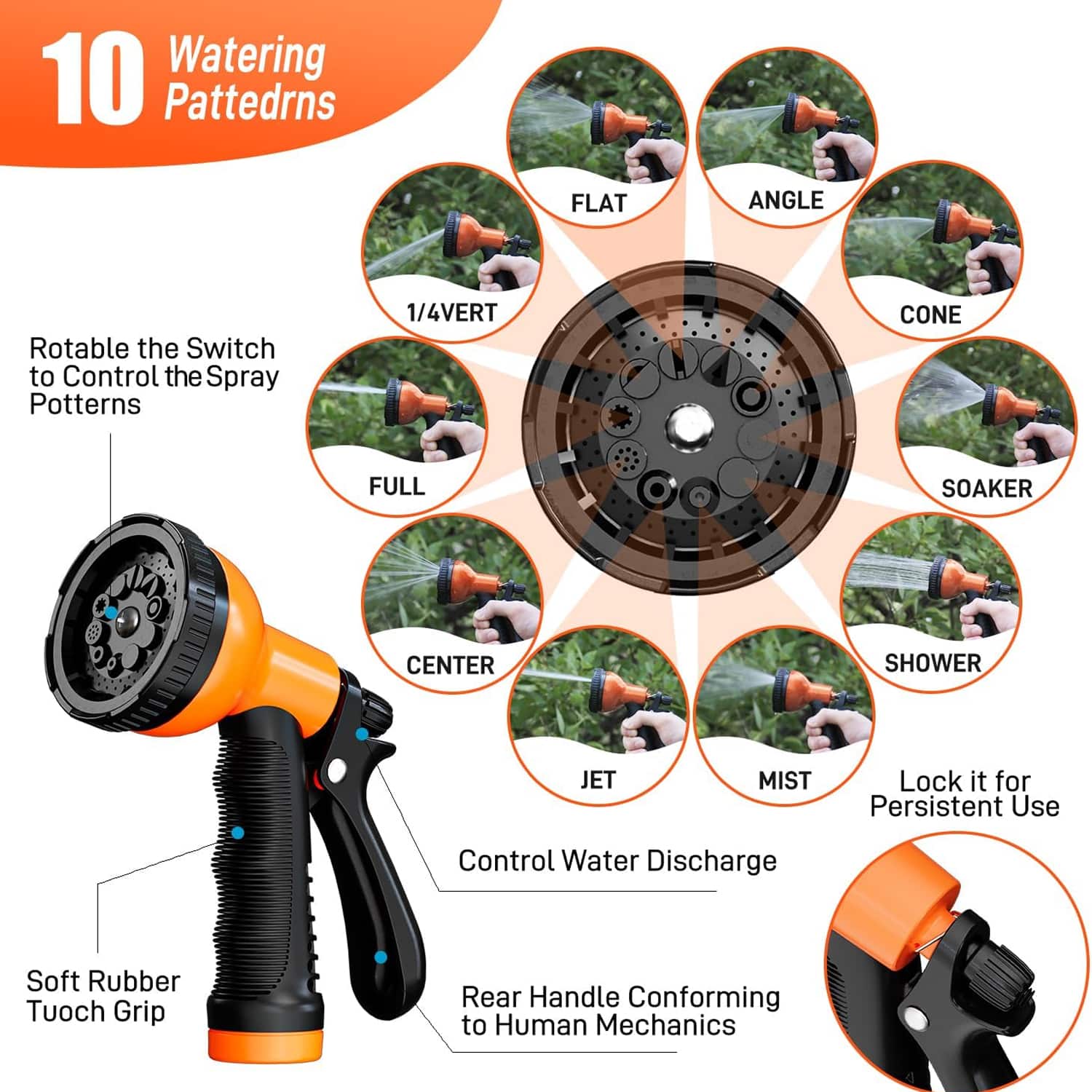 The FlicAqua Garden Hose includes an ergonomic nozzle with ten distinct spray patterns, ranging from gentle mist to powerful jet streams for various watering and cleaning applications.
