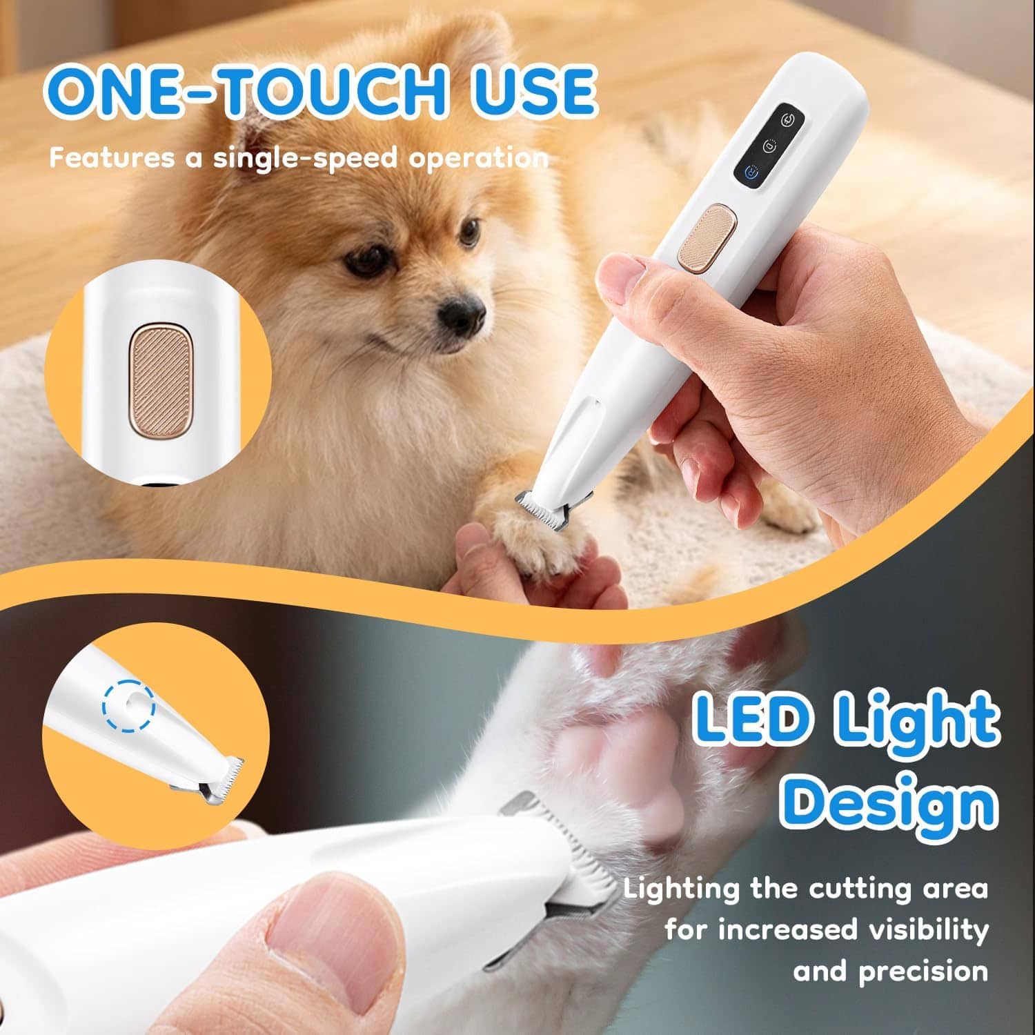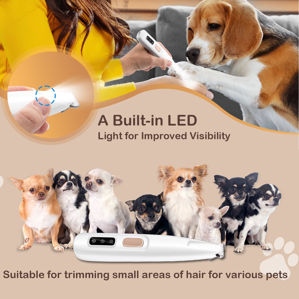 Yes, the integrated LED light is specifically designed to improve visibility on all fur colours, helping you see skin and pads clearly to avoid accidents.
