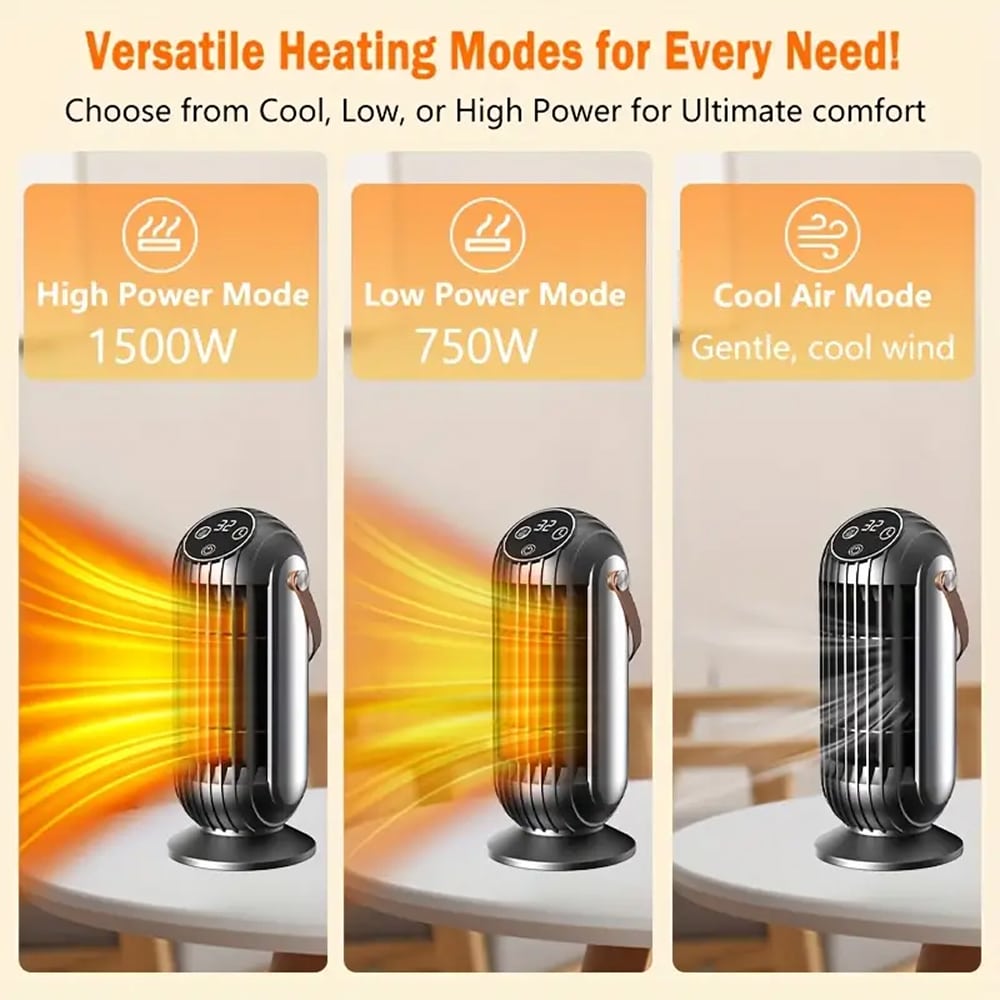 High Power Mode (1500W) delivers maximum heating for cold conditions, Low Power Mode (750W) provides energy-efficient warmth for maintaining comfortable temperatures, and Cool Air Mode circulates gentle, unheated air for ventilation during milder weather. You can easily switch between modes using the touch controls or remote.