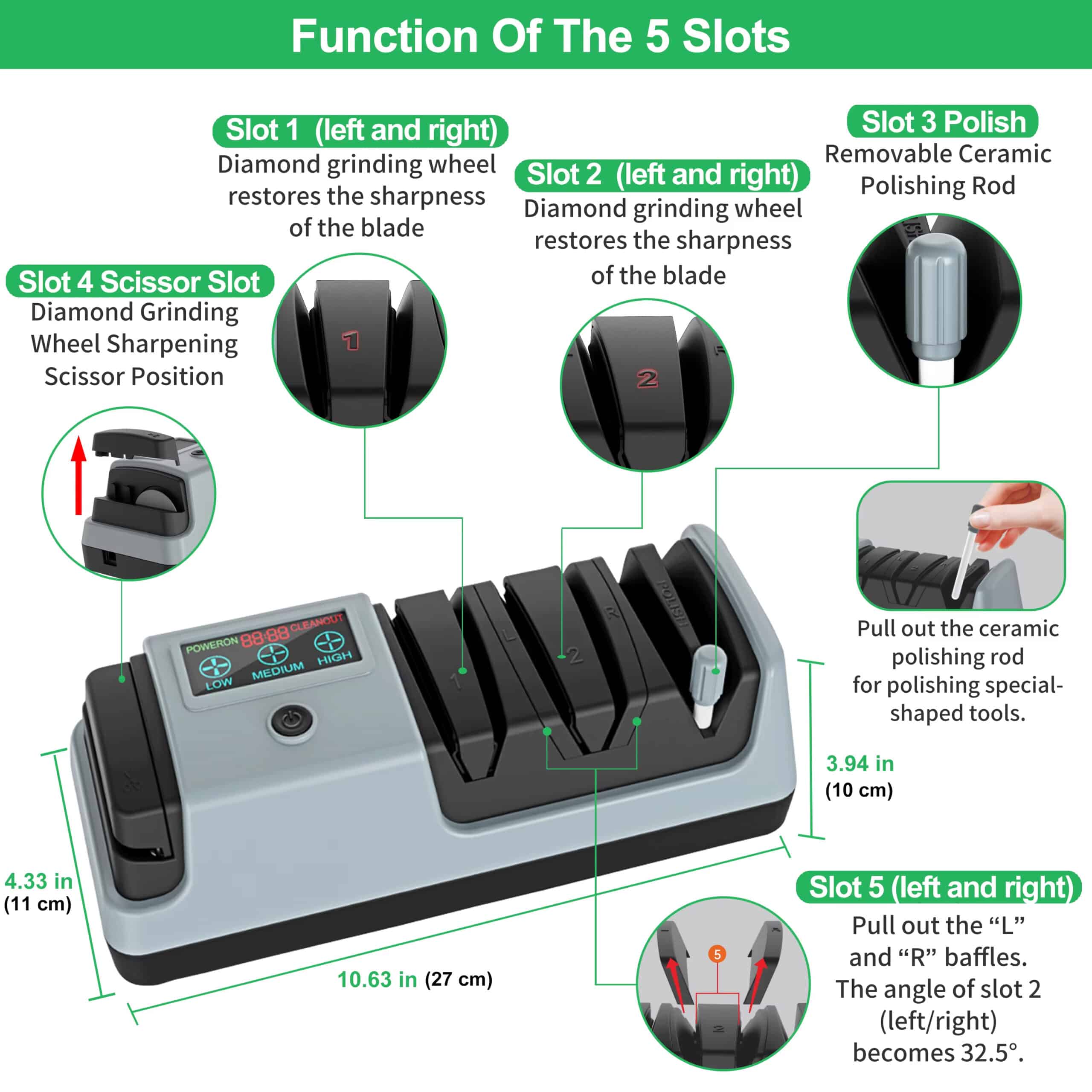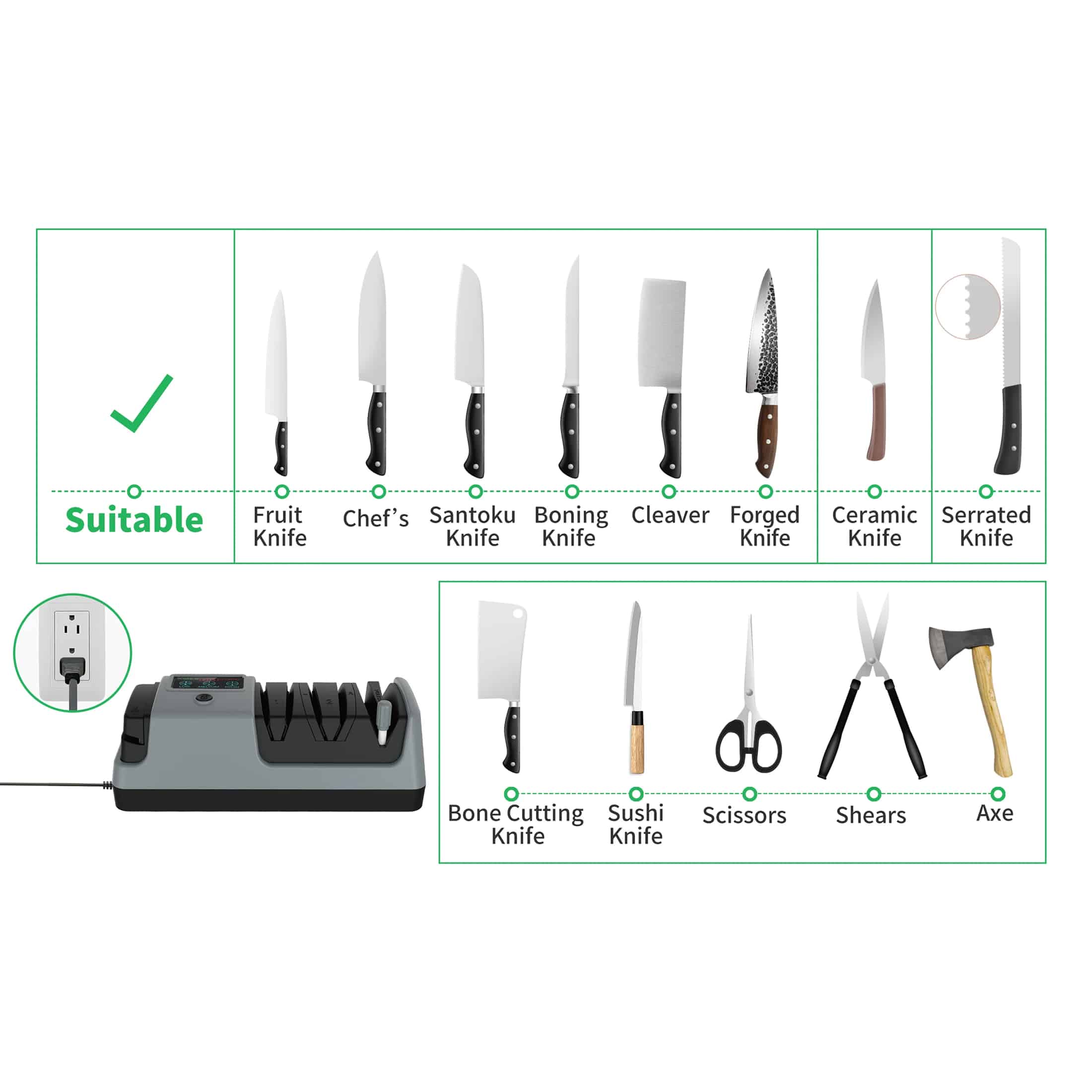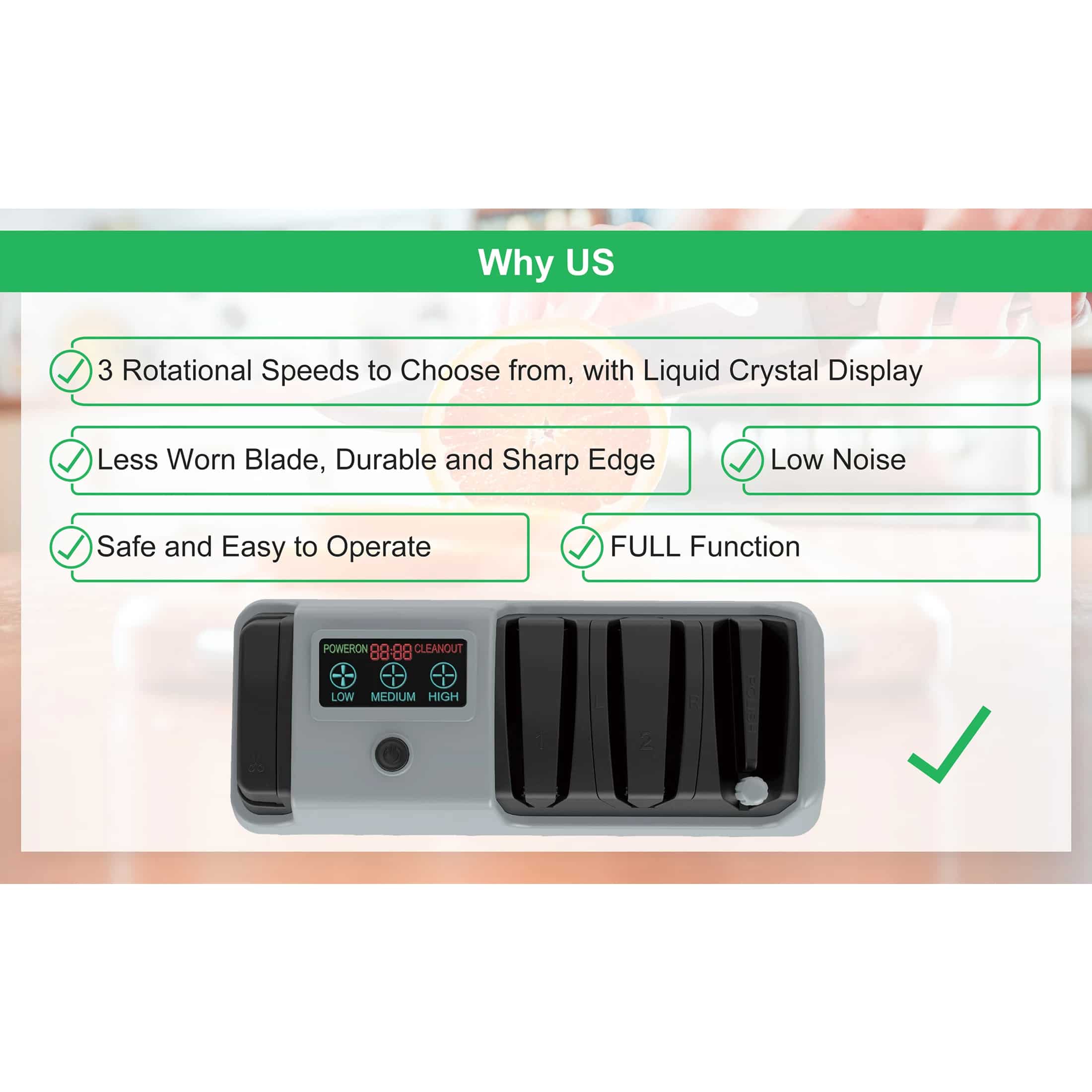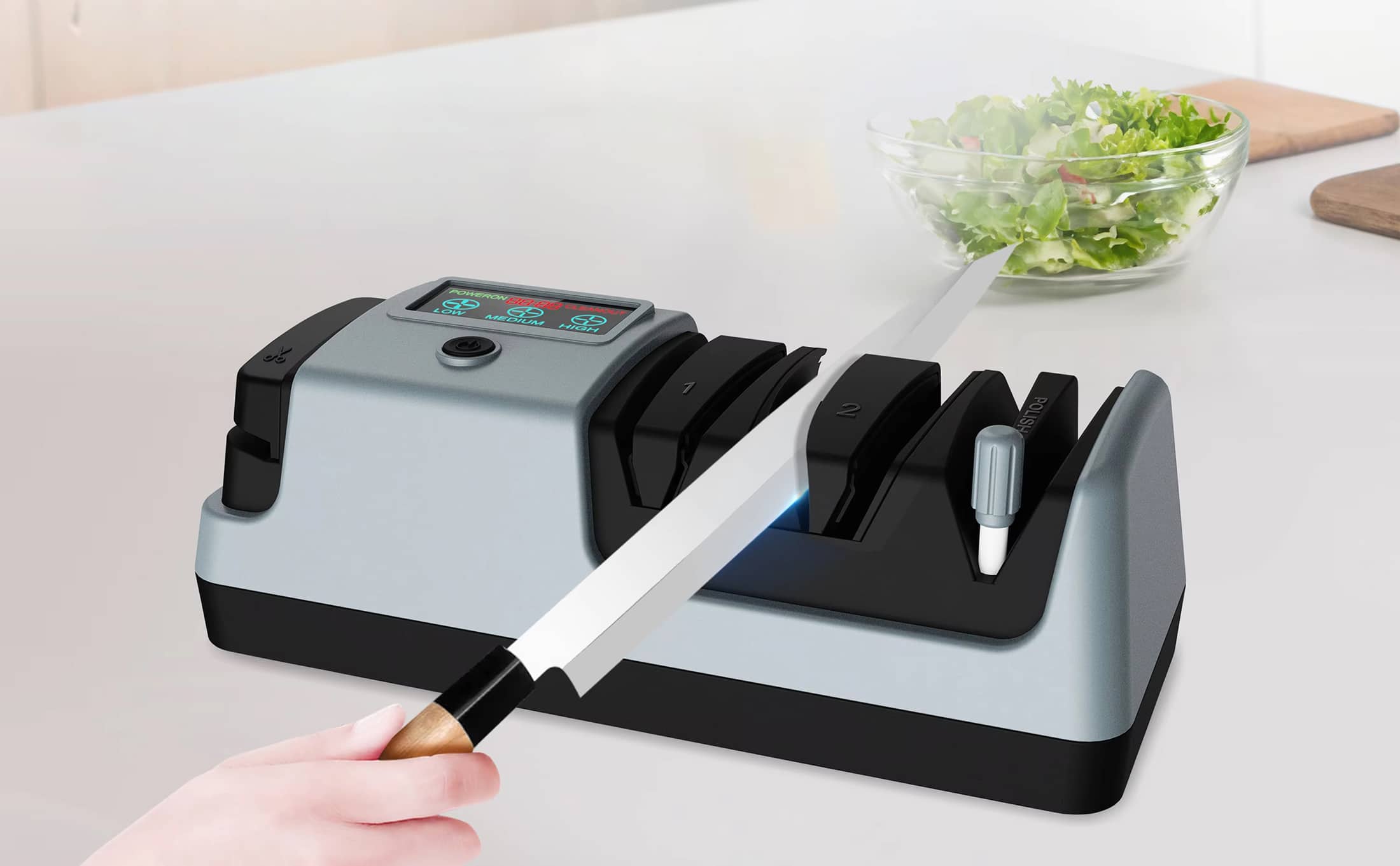 Use low speed for delicate Japanese knives, medium for standard kitchen knives, and high for heavily dulled or thicker blades. The adjustable settings protect your blade whilst delivering optimal sharpening.