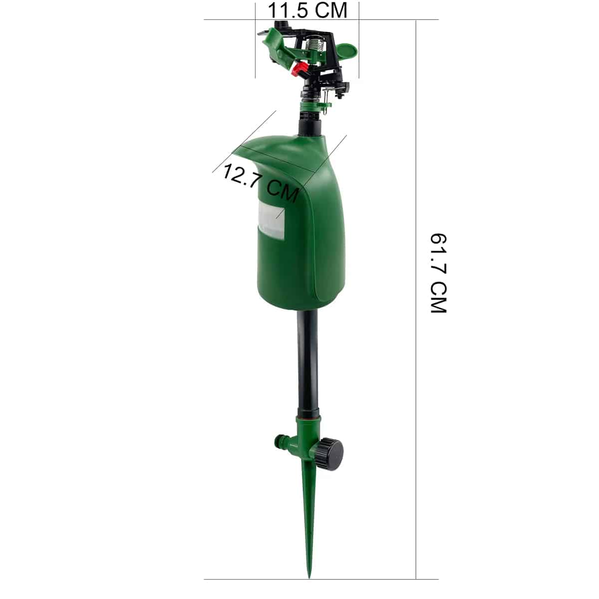 The PIR sensor detects movement within 10-metre range using 120-degree detection angle, instantly triggering 5-second water spray activation for immediate response.