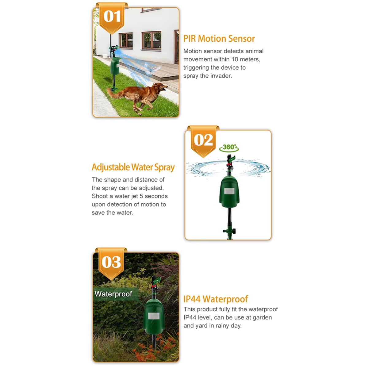 Instant activation delivers 5-second water spray immediately upon PIR motion sensor detection for maximum effectiveness and animal deterrence results.