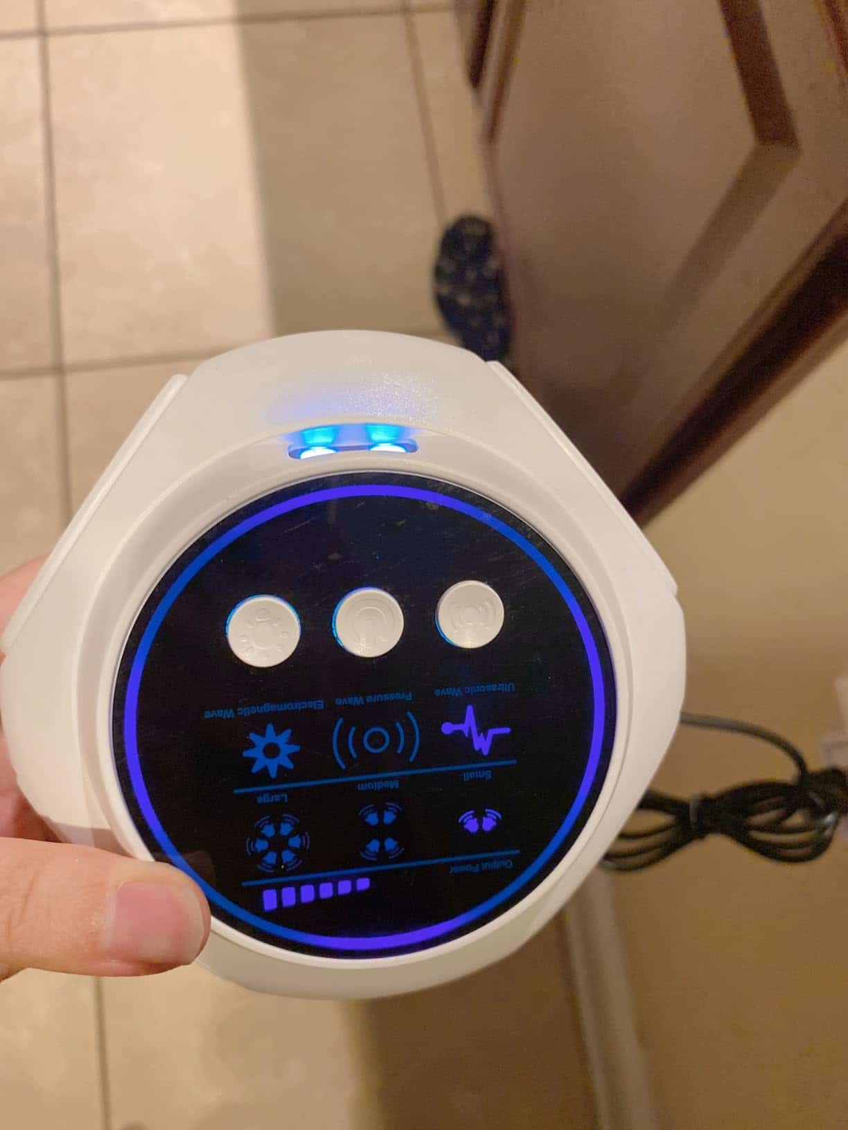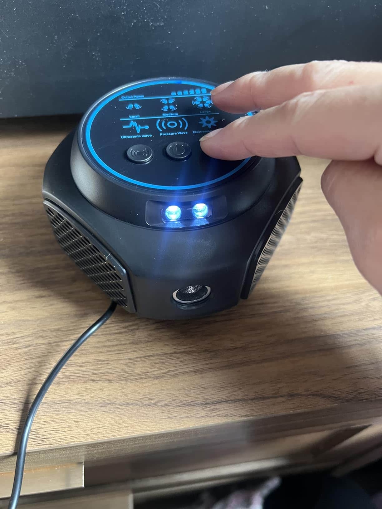 The LED strobe lights indicate active operation, and you can test the touch-sensitive controls to ensure proper functionality.