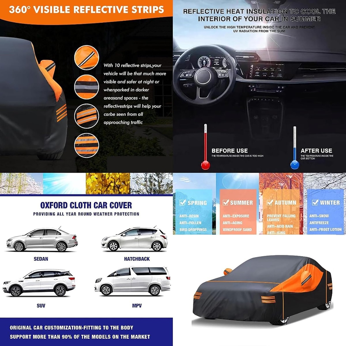 The SnoDefin Snow Car Cover features double-stitch construction and an elastic hem for superior durability and fit. Windproof straps prevent displacement during storms, whilst reflective strips enhance nighttime visibility, making it perfect for both outdoor and indoor use.