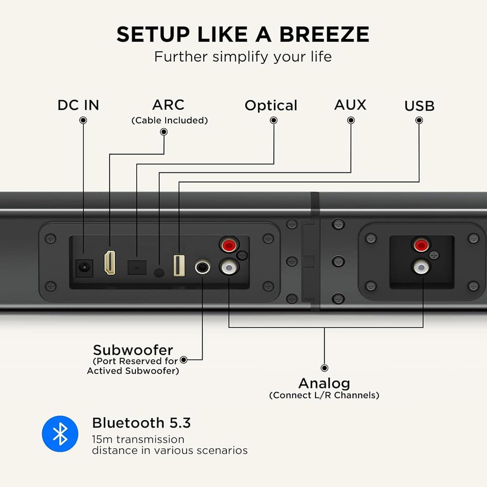 No installation needed. Simply connect via your preferred method—HDMI, optical, AUX, USB, or Bluetooth—and you're ready. The setup process takes minutes, with all cables included in the package.