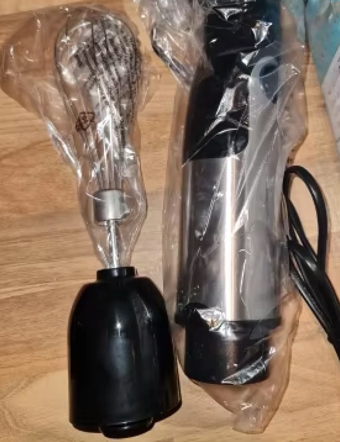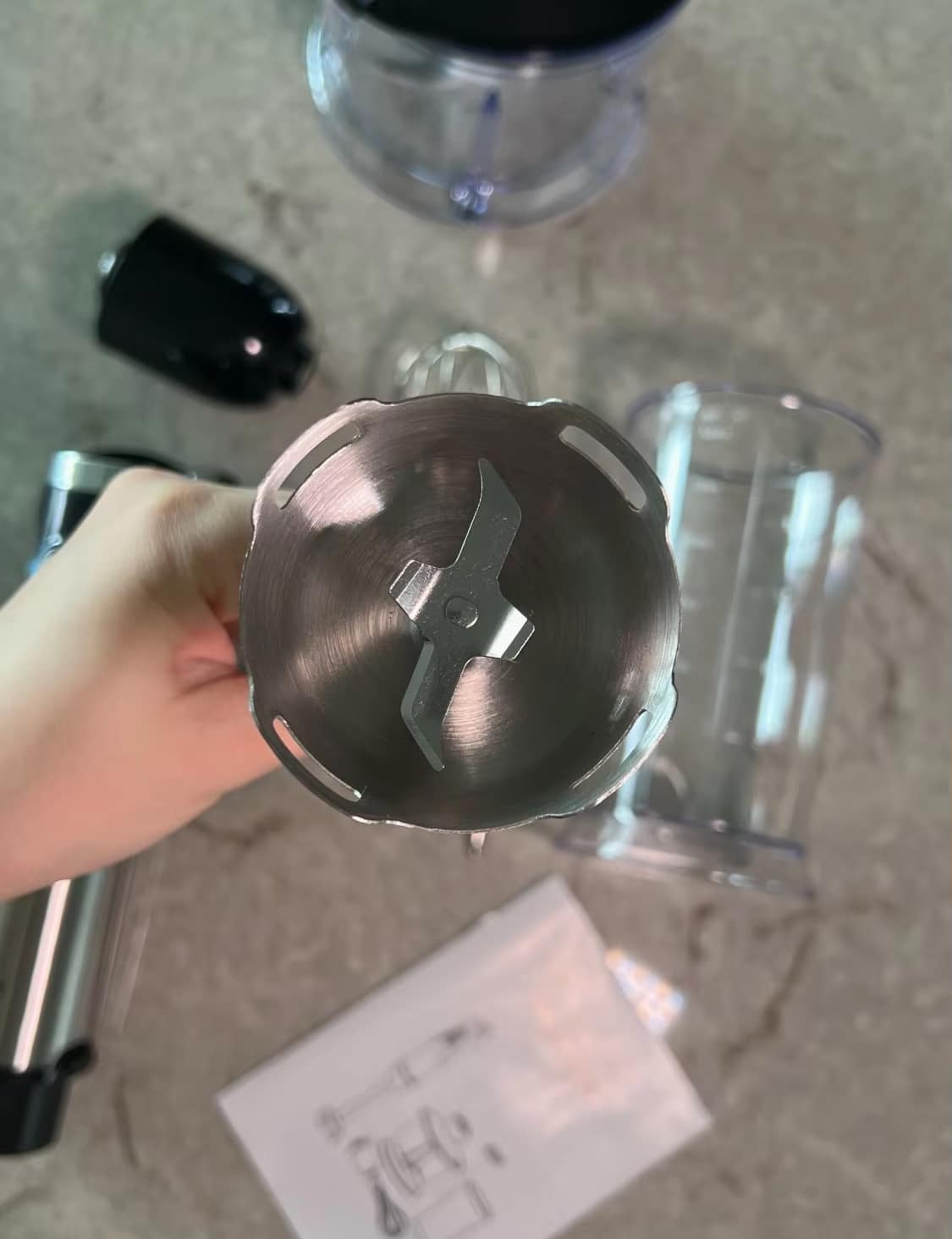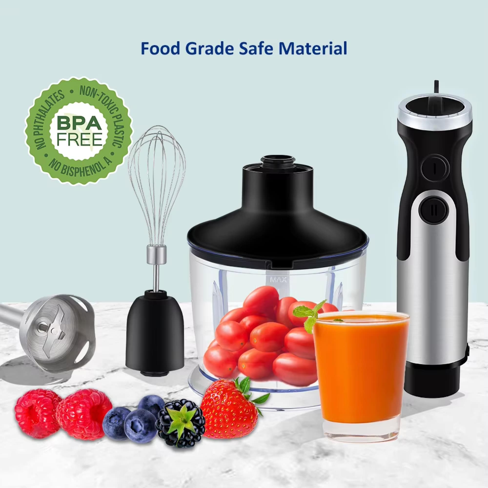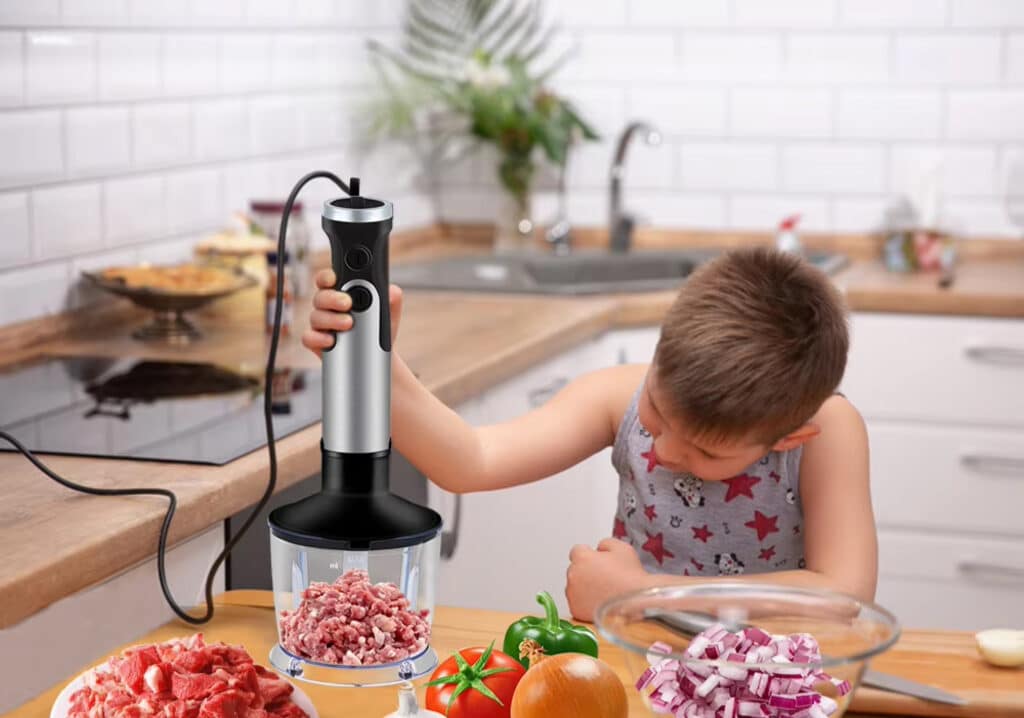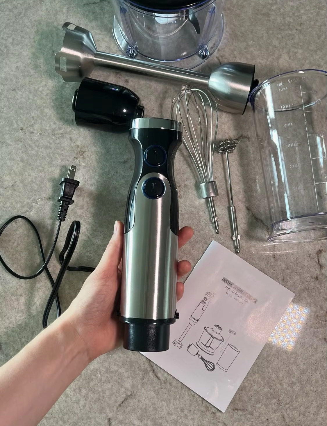 The complete set includes a blending shaft, whisk attachment, chopper bowl with blade, and beaker. These cover all essential kitchen blending and mixing tasks comprehensively.