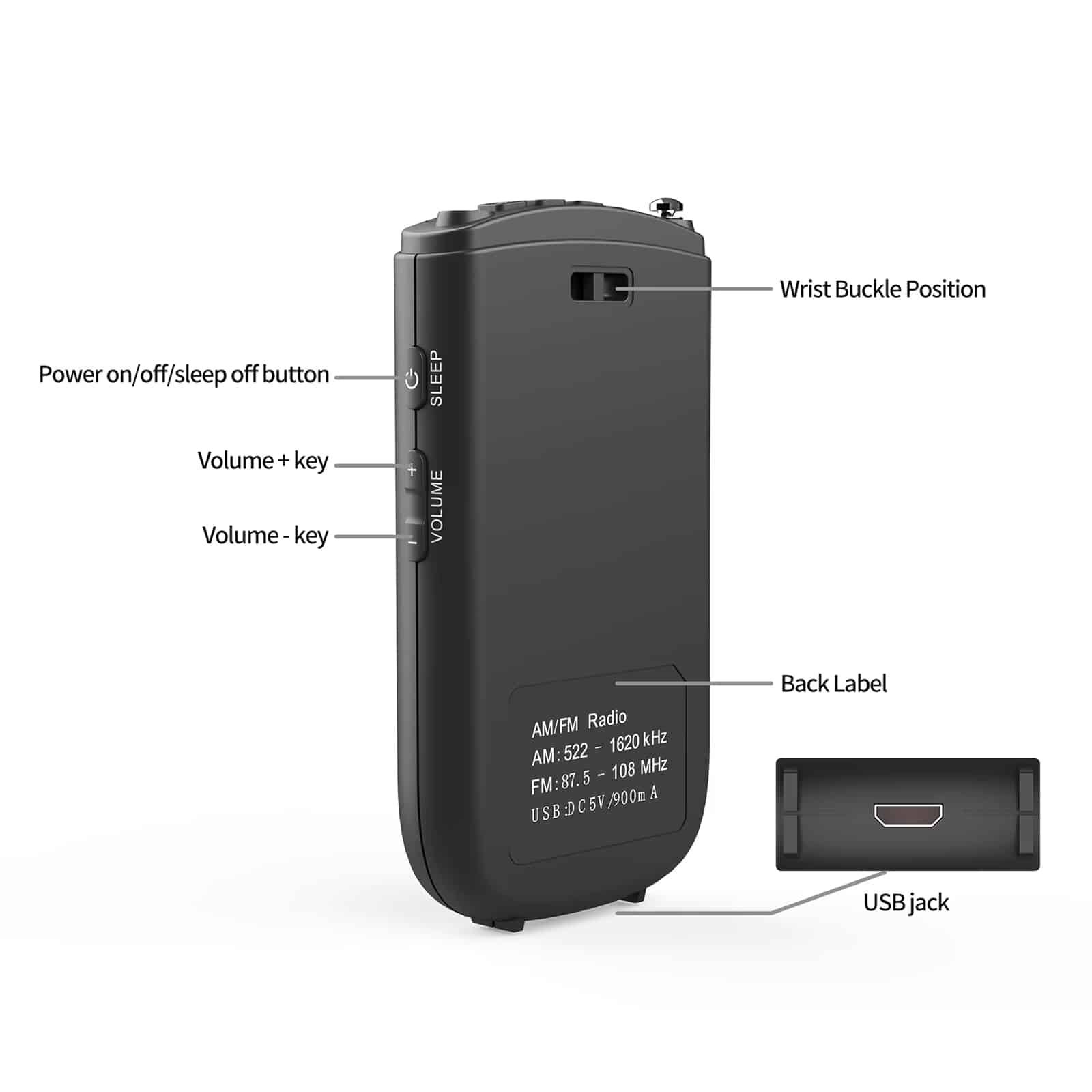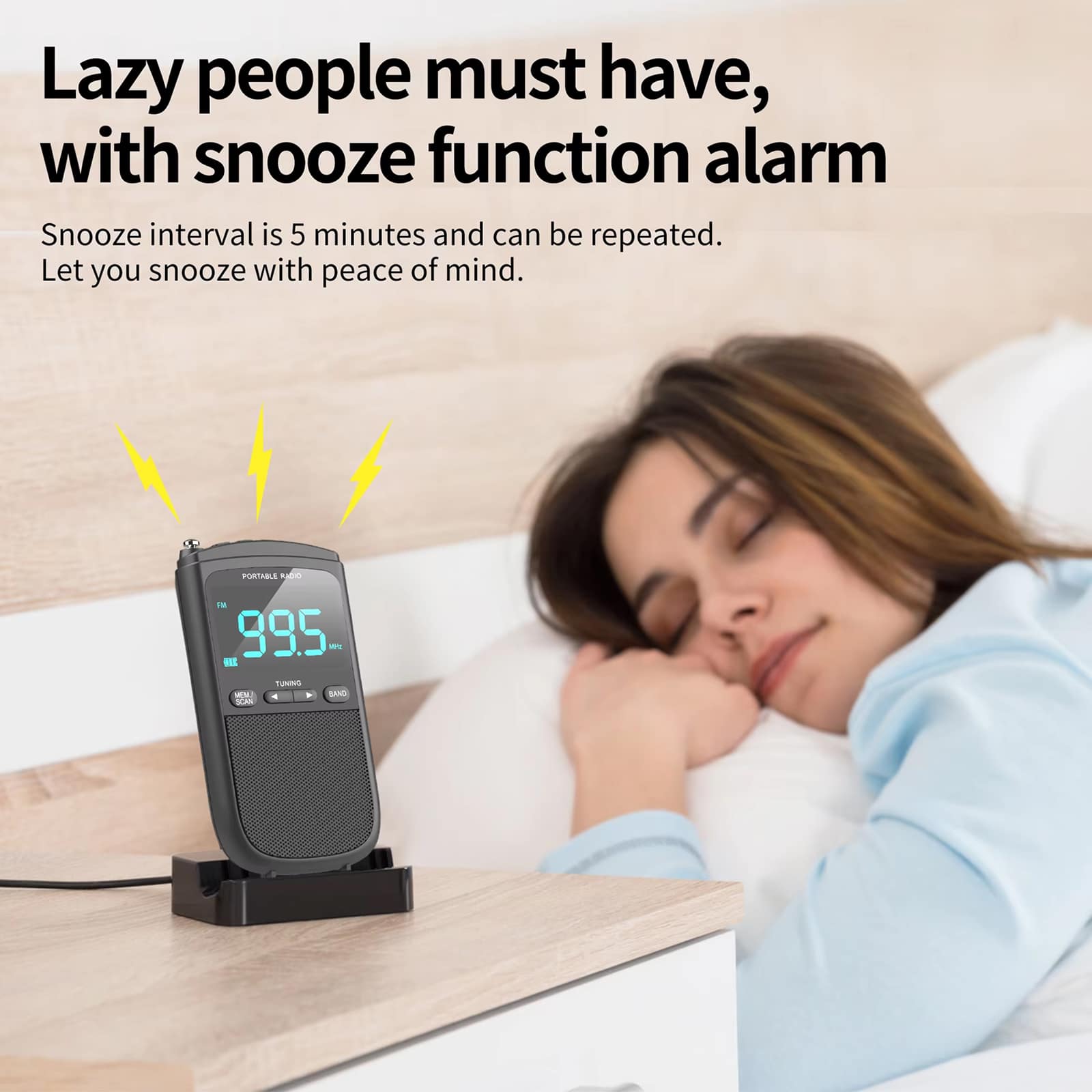 Use the intuitive side buttons to navigate to the clock settings. It is straightforward to set your wake-up time and activate the handy snooze feature.