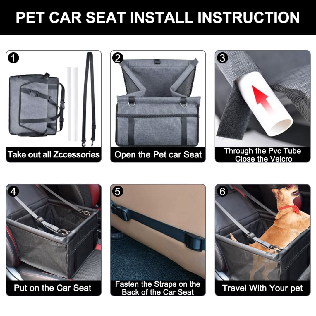 Simply secure the adjustable straps around your seat, attach the safety tether, and ensure all connections are tight before placing your pet inside.