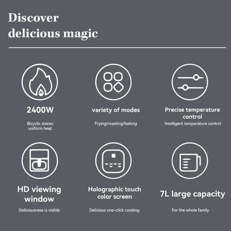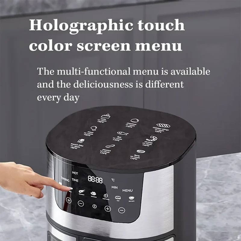 The 2400W bicyclic stereo heating system circulates hot air at high speed around food, creating a crispy exterior whilst sealing in moisture. This convection technology replicates deep-frying results using minimal to no oil whatsoever.
