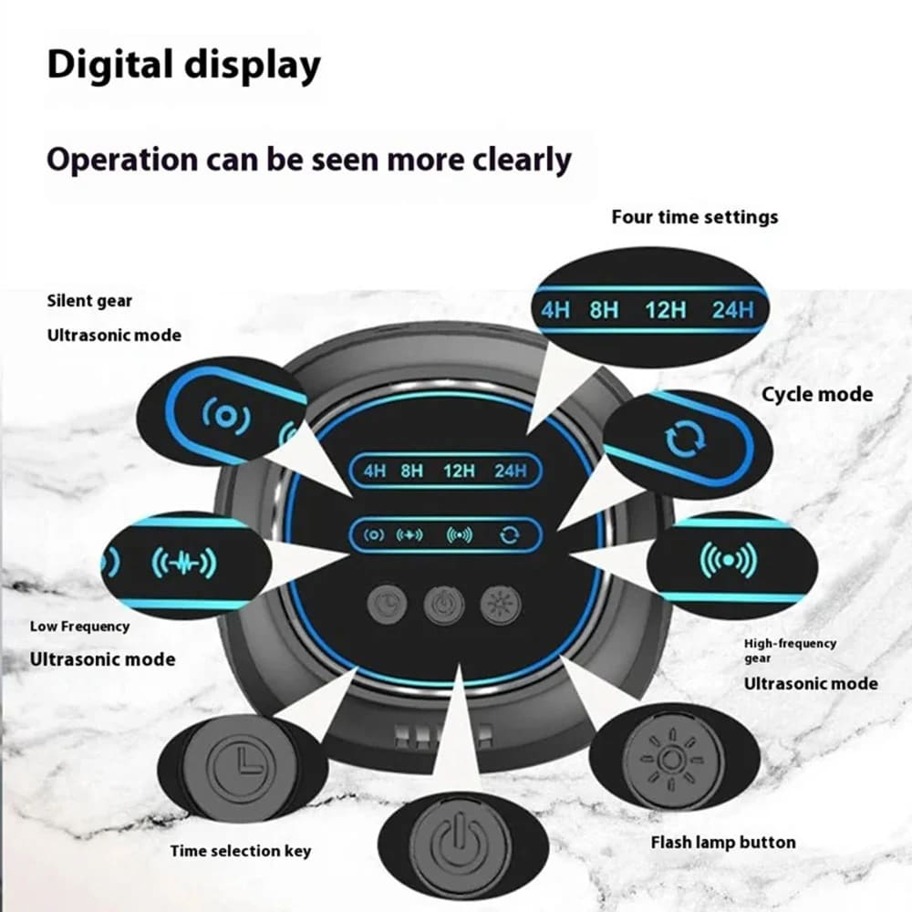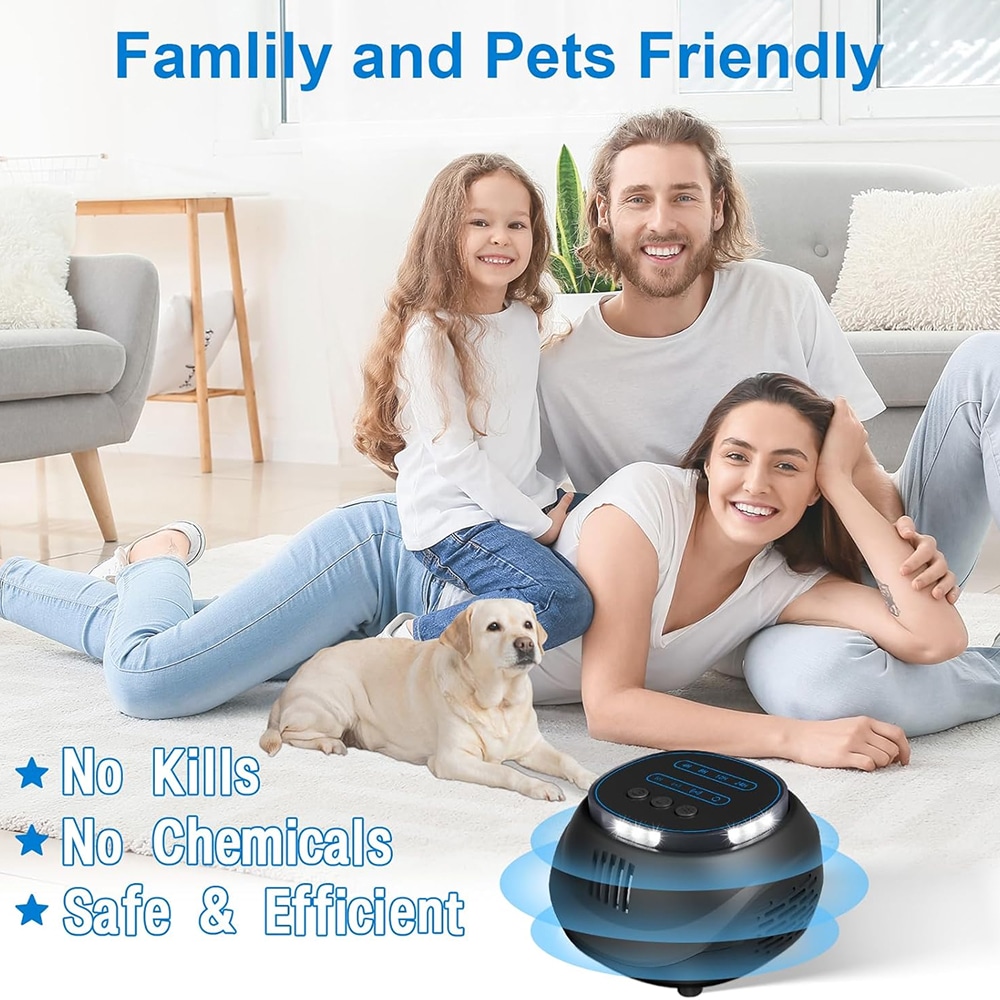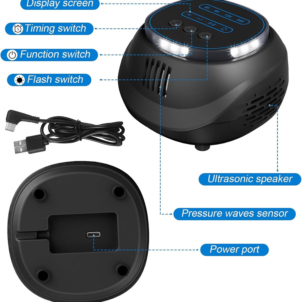 Absolutely safe around pets and children as it uses harmless ultrasonic frequencies and non-toxic LED light technology without chemicals.